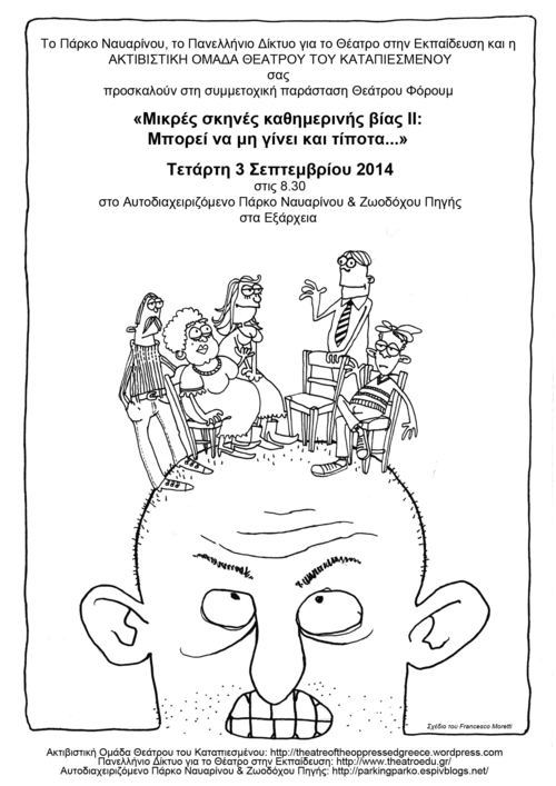 Το Πάρκο Ναυαρίνου, το Πανελλήνιο Δίκτυο για το Θέατρο στην Εκπαίδευση και η ΑΚΤΙΒΙΣΤΙΚΗ ΟΜΑΔΑ ΘΕΑΤΡΟΥ ΤΟΥ ΚΑΤΑΠΙΕΣΜΕΝΟΥ σας προσκαλούν στη συμμετοχική παράσταση Θεάτρου Φόρουμ
