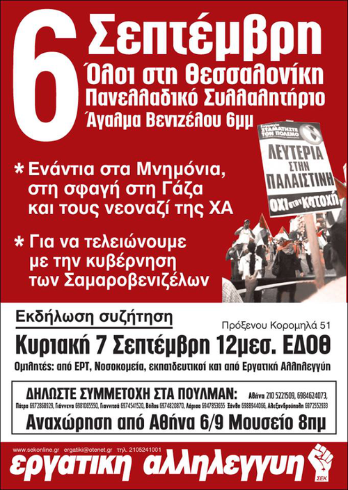 με και τώρα. Παίρνουμε δύναμη από τους αγώνες των ηρωικών καθαριστριών, της ΕΡΤ, των λιμενεργατών της COSCO, της Κόκα-κόλα, των εργαζόμενων στα Νοσοκομεία, όλου του δημόσιου που μπλόκαραν τα σχέδια του Μητσοτάκη για απολύσεις με φερετζέ την «αξιολόγηση». Στη Θεσσαλονίκη θα είμαστε όλοι εκεί: και οι απεργοί και τα συνδικάτα και οι διαδηλωτές στο πλευρό της Παλαιστίνης και οι αντιφασίστες. Για να απαιτήσουμε όλοι μαζί την ανατροπή της κυβέρνησης των Σαμαροβενιζέλων και να ανοίξουμε το δρόμο για να πάρουμε πίσω όλα όσα μας λεηλάτησαν: τις δουλειές μας, τους μισθούς, τις συντάξεις, τα σχολεία, τα νοσοκομεία μας.