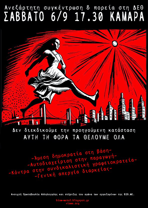 Το σωματείο εργαζομένων στην ΒΙΟ.ΜΕ. καλεί τα μέλη του και κάθε εργαζόμενο που νομίζει ότι το κυρίαρχο στην εργατική τάξη πρέπει είναι η συνέλευση και όχι η ανάθεση, να πορευτεί μαζί μας σε ανεξάρτητη συγκέντρωση και πορεία στην καμάρα την 06/09/2014 στης 18:00 σε συνάντηση με όλα τα κινήματα .