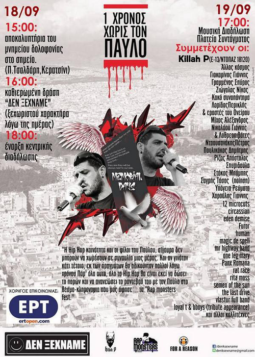Στις 18 Σεπτέμβρη συμπληρώνεται ένας χρόνος από την δολοφονία του αντιφασίστα μουσικού Παύλου Φύσσα (Killah P) από νεοναζί της Χρυσής Αυγής στην εργατογειτονιά του Κερατσινίου. Η ημερομηνία αυτή δεν είναι μόνο μια μαύρη επέτειος μνήμης ενός καλλιτέχνη αγωνιστή αλλά και μια μαύρη επέτειος της μαχαιρωμένης δημοκρατίας μας από νεοφασίζουσες πολιτικές.