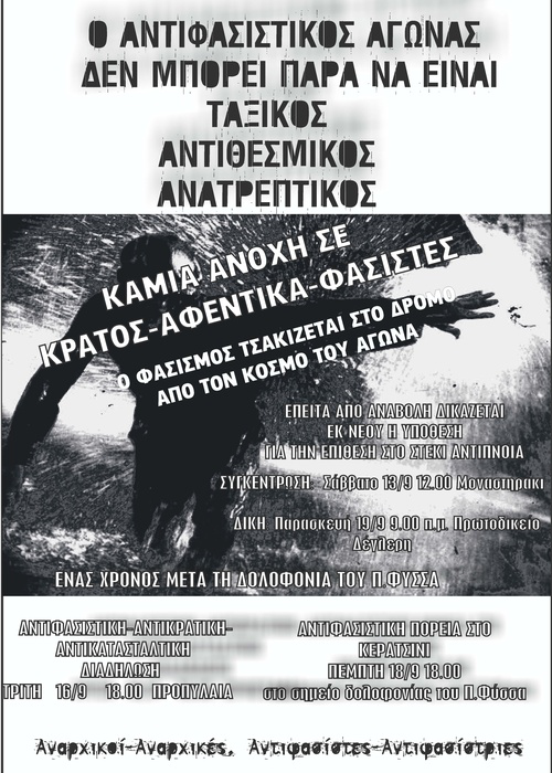 Κείμενο για τον έναν χρόνο από την δολοφονία του Π.Φύσσα και το δικαστήριο για την επίθεση στο αναρχικό Στέκι Αντίπνοια.