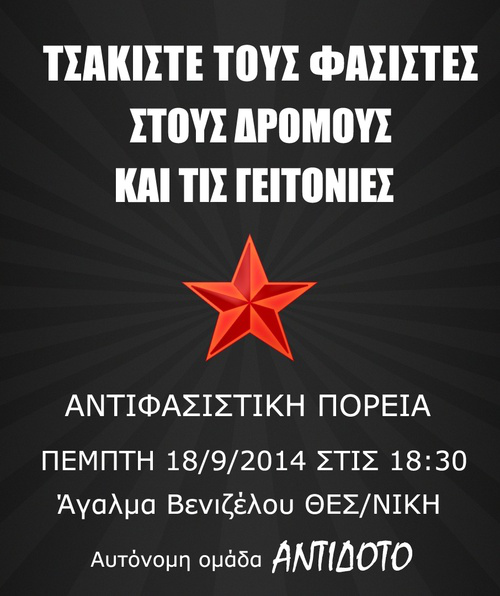 Ο ΣΥΡΙΖΑ Θεσσαλονίκης συμμετέχει και καλεί στην αντιφασιστική πορεία που θα πραγματοποιηθεί την Πέμπτη 18 Σεπτεμβρίου 2014, στις 6.30 μ.μ. από το άγαλμα του Βενιζέλου (Εγνατίας με Αριστοτέλους).