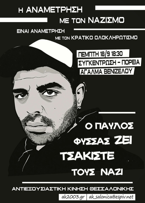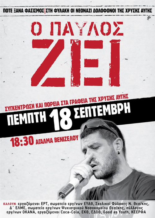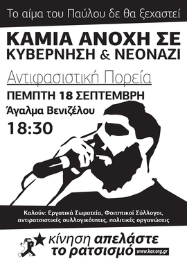 Πέμπτη 18 Σεπτέμβρη 6:30 μμ Άγαλμα Βενιζέλου Αντιφασιστικό Συλλαλητήριο 1χρόνο από την Δολοφονία του Παύλου Φύσσα από τους φασίστες χρυσαυγίτες