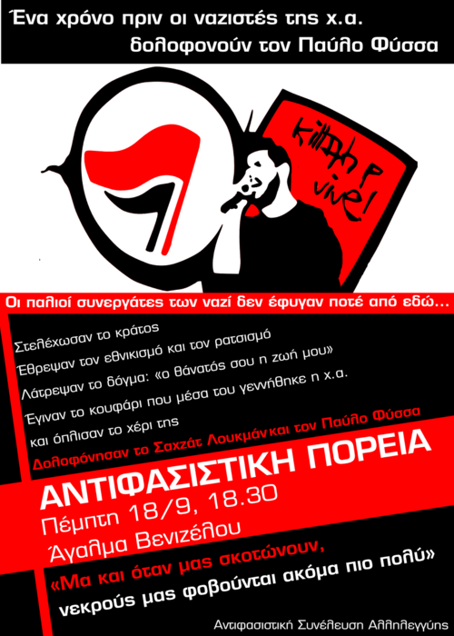 Πέρασε ένας χρόνος από την δολοφονία του Παύλου Φύσσα. Ένα χρόνος μέσα στον οποίο είδαμε με οργή τους μισθούς να μειώνονται, τα νοσοκομεία να κλείνουν, τα επιδόματα να εξαφανίζονται, τους μπάτσους να οργιάζουν, την κατάσταση εξαίρεσης να επεκτείνεται σε όλο και περισσότερους/ ες από εμάς. Είδαμε όμως και το κράτος «μπροστάρη» του «αντιφασιστικού αγώνα» να κυνηγάει τους φασίστες. Είδαμε στελέχη της συμμορίας να οδηγούνται στη φυλακή, συνομιλίες και φωτογραφίες τους να δημοσιοποιούνται και -κυρίως- τις διακηρύξεις που υπόσχονταν πάταξη της δράσης της ναζιστικής γκρούπας.