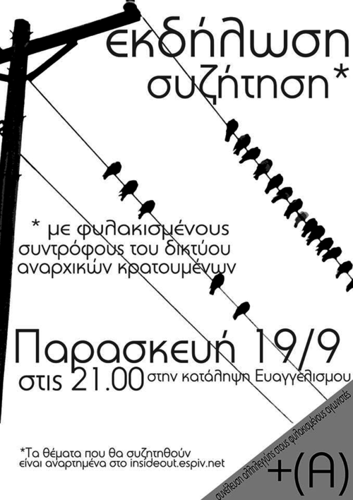Την Παρασκευή 19/9 στις 21.00 θα πραγματοποιηθεί Εκδήλωση- Συζήτηση στην Κατάληψη Ευαγγελισμού με μέλη του Δικτύου Αναρχικών Κρατουμένων από τις φυλακές Κορυδαλλού.