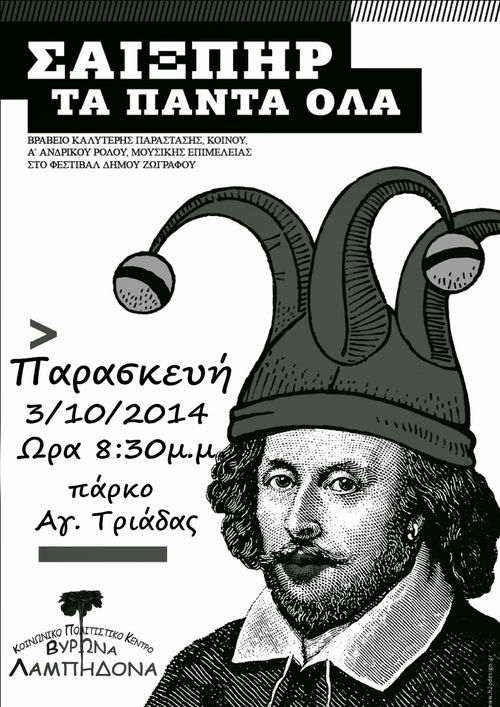 Το Κοινωνικό Πολιτιστικό Κέντρο Βύρωνα σας καλεί την Παρασκευή 3 Οκτωβρίου στις 20:30 στην θεατρική παράσταση ''Σαίξπηρ τα πάντα όλα''.