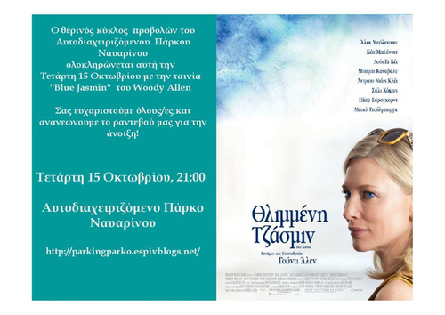 O θερινός κύκλος προβολών του Αυτοδιαχειριζόμενου Πάρκου Ναυαρίνου κλείνει την Τετάρτη 15 Οκτωβρίου με την ταινία ´´Blue Jasmine´´ του Woody Allen.