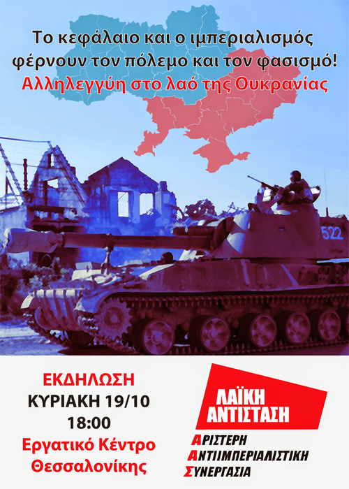 Εκδήλωση Λαϊκής Αντίστασης-ΑΑΣ για την Ουκρανία τηνΚυριακή 19/10, 18:00 στο Εργατικό Κέντρο Θεσσαλονίκης.