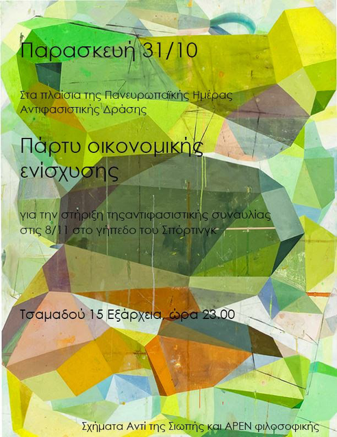 Την Παρασκευή 31 Οκτώβρη τα φοιτητικά σχήματα του Αντί της Σιωπής και της ΑρΕν Φιλοσοφικής κάνουν θεματικό αντιφασιστικό πάρτυ στο στέκι Μεταναστών (Τσαμαδού 15). Σκοπός μας η οικονομική ενίσχυση της αντιφασιστικής συναυλίας στις 8 Νοέμβρη στο γήπεδο του Σπόρτινγκ εν όψει της πανευρωπαϊκής ημέρας αντιφασιστικής δράσης.