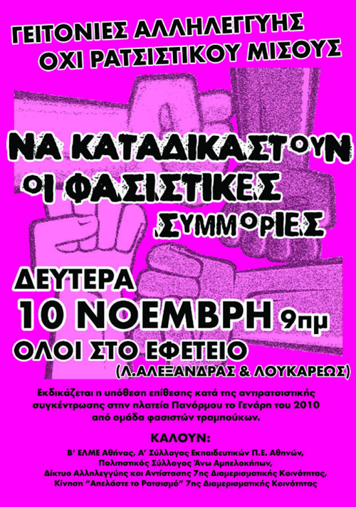 Αντιφασιστική συγκέντρωση, Δευτέρα 10/11, 9πμ στο Εφετείο (Αλεξάνδρας & Λουκάρεως)