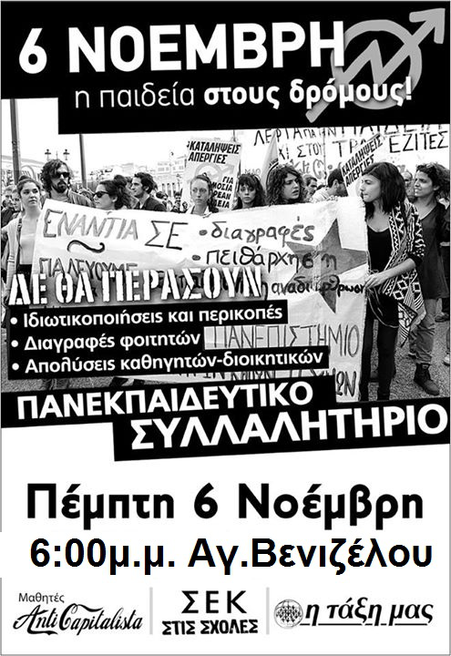 Είναι πια ξεκάθαρο πως η κυβέρνηση διαλύει την παιδεία, κλείνει τα σχολεία, απολύει καθηγητές και ανοίγει την πόρτα στους ιδιώτες την ίδια ώρα που σπαταλάνε λεφτά για τα χρέη στις τράπεζες και σε πολεμικούς εξοπλισμούς στις νέες ιμπεριαλιστικές επεμβάσεις του ΝΑΤΟ στο Ιράκ και τη Συρία.