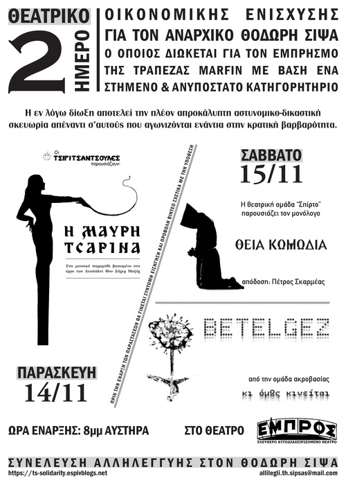 ΘΕΑΤΡΙΚΟ 2ΗΜΕΡΟ ΟΙΚΟΝΟΜΙΚΗΣ ΕΝΙΣΧΥΣΗΣ ΓΙΑ ΤΟΝ ΑΝΑΡΧΙΚΟ ΘΟΔΩΡΗ ΣΙΨΑ, Ο ΟΠΟΙΟΣ ΔΙΩΚΕΤΑΙ ΓΙΑ ΤΟΝ ΕΜΠΡΗΣΜΟ ΤΗΣ ΤΡΑΠΕΖΑΣ MARFIN ΜΕ ΒΑΣΗ ΕΝΑ ΣΤΗΜΕΝΟ ΚΑΙ ΑΝΥΠΟΣΤΑΤΟ ΚΑΤΗΓΟΡΗΤΗΡΙΟ ΚΑΙ ΔΙΚΑΖΕΤΑΙ ΤΗΝ 1η ΔΕΚΕΜΒΡΙΟΥ 2014.