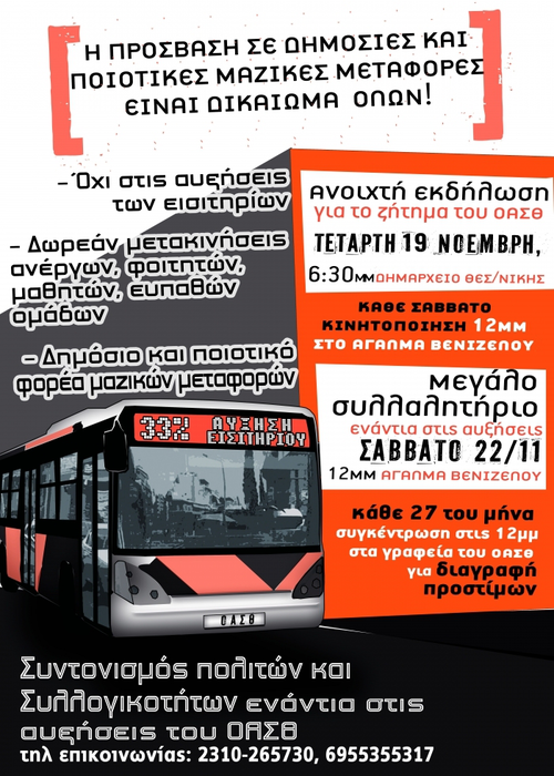 Διανύουμε ήδη την 9η εβδομάδα των κινητοποιήσεων ενάντια στο χαράτσι στα εισιτήρια του ΟΑΣΘ, που επιβλήθηκε τον Οκτώβρη, με μια αύξηση 33%! στα εισιτήρια των λεωφορείων (από 0,80 σε 1ευρώ στα εισιτήρια μονής διαδρομής και από 0,90 σε 1,20 της διπλής διαδρομής, με αντίστοιχη αύξηση των μειωμένων) και έχουν προαναγγείλει κι άλλη μέσα στο 2015!, χουντική συγκυβέρνηση - ΟΑΣΘ συνεχίζουν την επίθεση στους εργαζόμενους και τα φτωχά λαϊκά στρώματα. Παράλληλα περιορίστηκαν τα δρομολόγια κάνοντας την κατάσταση πιο αφόρητη (αναμονή στις στάσεις, υπεράριθμοι στα λεωφορεία κτλ). Τιμώρησαν όλους εμάς (εργαζόμενους, ανέργους, φοιτητές, μαθητές, συνταξιούχους κτλ) που αναγκαζόμαστε να στοιβαζόμαστε μέσα στα λεωφορεία του ΟΑΣΘ, γιατί δεν διαθέτουμε άλλο μέσο μετακίνησης! Ενώ ταυτόχρονα έχουν καταργήσει τα νυχτερινά δρομολόγια δημιουργώντας τεράστιο πρόβλημα σε εργαζόμενους που σχολάνε αργά το βράδυ από τις δουλείες τους.