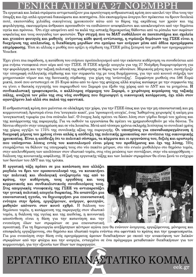 Έχει γίνει πια παράδοση, η κατάθεση του ετήσιου προϋπολογισμού από την εκάστοτε κυβέρνηση να συνοδεύεται από μια ετήσια ντουφεκιά στον αέρα από την ΓΣΕΕ. Η ΓΣΕΕ κήρυξε απεργία για της 27 Νοέμβρη διαμαρτυρόμενη για την φορολόγηση και την ταξική πολιτική της κυβέρνησης σε βάρος των αδυνάτων. Μερικούς μήνες πριν, πανηγύριζε την υπογραφή συλλογικής σύμβασης και την συμφωνία της με τους βιομήχανους, για την από κοινού στήριξη των μνημονιακών νόμων και της δανειακής σύμβασης για χάρη της 'ανάπτυξης'. Συμφώνησε μισθούς στα 586 Ευρώ μικτά, ποσό που αντιστοιχεί σε 25 Ευρώ κάτω από το όριο της φτώχιας αλλά κυρίως κατάφερε με την συμφωνία της να γίνει ο βασικός εγγυητής του παραμυθιού του Σαμαρά για έξοδο της χώρας από το ΔΝΤ και τα μνημόνια. Η συνδικαλιστική γραφειοκρατία, ο καλλίτερος σύμμαχος του Σαμαρά, ο χειρότερος κομπάρσος της ταξικής πάλης, αναζητά τον ρόλο της στις νέες συνθήκες που δημιουργεί η οικονομική κατάρρευση, όχι πλάι στον αγωνιζόμενο λαό αλλά στα παλιά της αφεντικά.