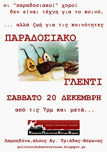 Το ΣΑΒΒΑΤΟ 20/12, από τις 19:00 και μετά, σας προσκαλούμε σε παραδοσιακό γλέντι με μουσικές, τραγούδια και χαμόγελα από την Κρήτη, τα νησιά, τη Μακεδονία και φυσικά την Ήπειρο και τη Θράκη...