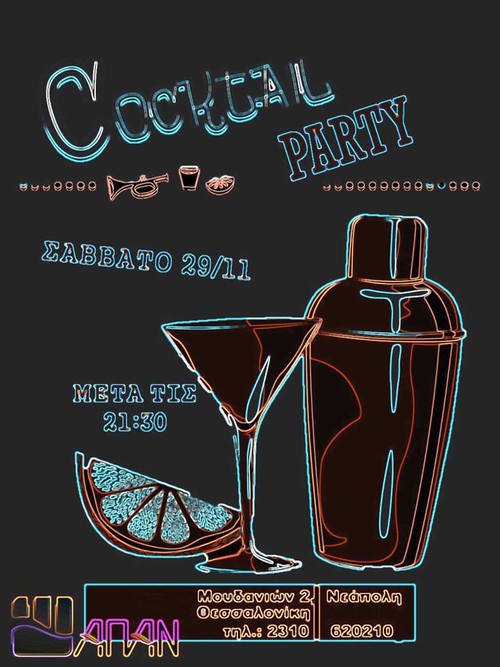 Mετά το παζάρι κοινωνικής αλληλεγγύης της Α.ΠΑ.Ν ,όπου τα έσοδα θα διατεθούν στον αγωνιζόμενο λαό του Κομπάνι ,(https://www.facebook.com/events/781903615206037/)σας περιμένουμε το βράδυ σε ενα Cocktail Party. Προσκαλούμε τους ανήσυχους νέους και όχι μόνο για να συζητήσουμε, να γνωριστούμε καλύτερα και να περάσουμε καλά σε ένα όμορφο περιβάλλον στο στέκι της Α.ΠΑ.Ν.