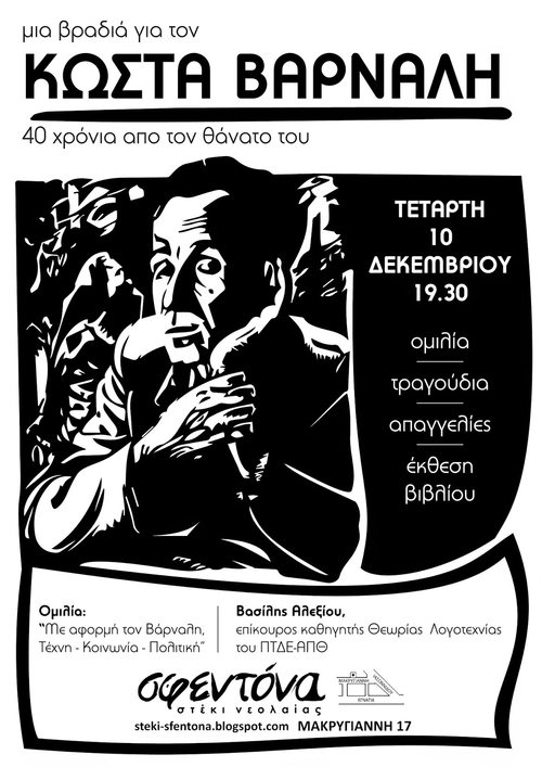 Την Τετάρτη 10 Δεκεμβρίου στις 19:30 το στέκι Σφεντόνα διοργανώνει μια βραδιά για τον Βάρναλη