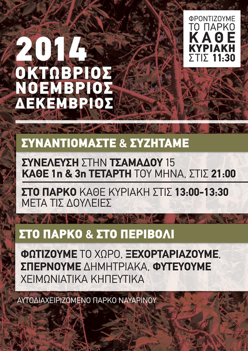 Ανοιχτή Συνέλευση Πάρκου Ναυαρίνου : Συναντιόμαστε α) Στην Τσαμαδού 15 ώρα 21:00 κάθε 1η και 3η Τετάρτη του μήνα, και β) στο Πάρκο κάθε Κυριακή στις 11:30