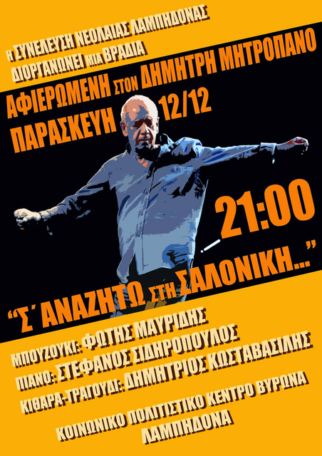 Η ομάδα νεολαίας του Κοινωνικού Πολιτιστικού Κέντρου Βύρωνα σας καλεί την Παρασκευή 12 Δεκέμβρη και ώρα 21:00 σε μια μουσική βραδιά αφιερωμένη στον Δημήτρη Μητροπάνο. Η εκδήλωση θα περιλαμβάνει βίντεο από την ζωή του καθώς και την λαϊκή ορχήστρα του Δ.Κωσταβασίλη που θα ερμηνεύσει τραγούδια απο το ρεπερτόριο του. Είσοδος (προφανώς) δωρεαν.