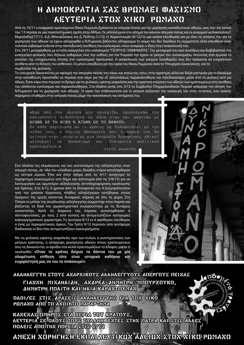 Από τις 10/11 ο αναρχικός κρατούμενος Νίκος Ρωμανός βρίσκεται σε απεργία πείνας για την χορήγηση εκπαιδευτικών αδειών, μιας που τον Ιούνιο του '13 πέρασε σε μια πανεπιστημιακή σχολή στην Αθήνα. Ως αλληλέγγυοι στο αίτημα του κάνουν απεργία πείνας και οι αναρχικοί φυλακισμένοι Γ. Μιχαηλίδης(17/11), Α.Δ. Μπουρζούκος και Δ. Πολίτης (1/12), Η. Καραντουμάν (6/12). Για μια ανάσα ελευθερίας και με όλες τις αιτήσεις του για τη χορήγηση των αδειών να έχουν απορριφθεί ο Ν.Ρωμανός βάζοντας οδόφραγμα το σώμα του δεν διεκδικεί τη νομιμότητα αλλά απευθύνει έναν πολιτικό εκβιασμό ενάντια στην ισοπεδωτική συνθήκη του εγκλεισμού, όπως αναφέρει ο ίδιος στην ανακοίνωσή του.