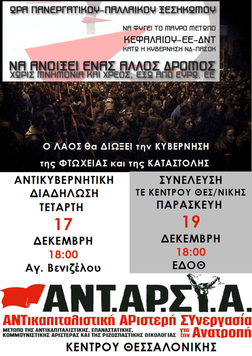 η ΑΝΤΑΡΣΥΑ Κέντρου Θεσσαλονίκης καλεί στην Αντικυβερνητική διαδήλωση την Τετάρτη 17/12, 18:00 στο άγαλμα Βενιζέλου