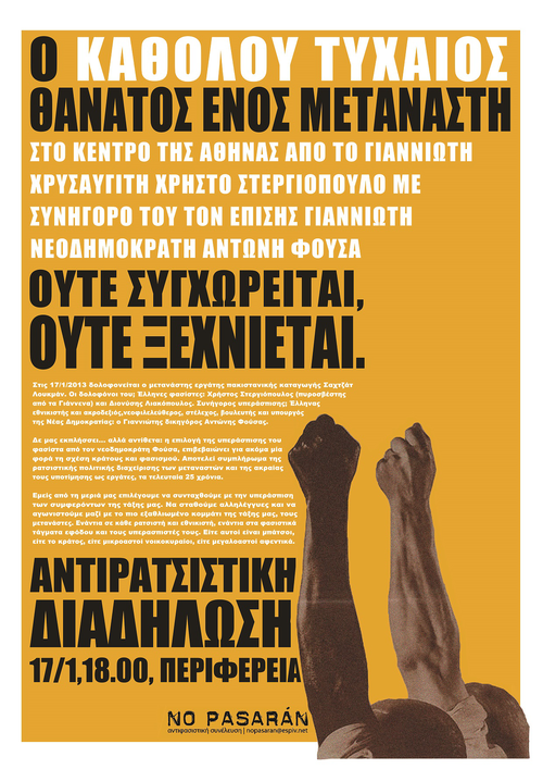 Αντιρατσιστική διαδήλωση καλεί η αντιφασιστική συνέλευση No Pasaran στις 17/1 στις 18:00 στην περιφέρεια για τα 2 χρόνια από την δολοφονία του εργάτη μετανάστη από το Πακιστάν Σ. Λουκμάν από χρυσαυγίτες στο κέντρο της αθήνας.
