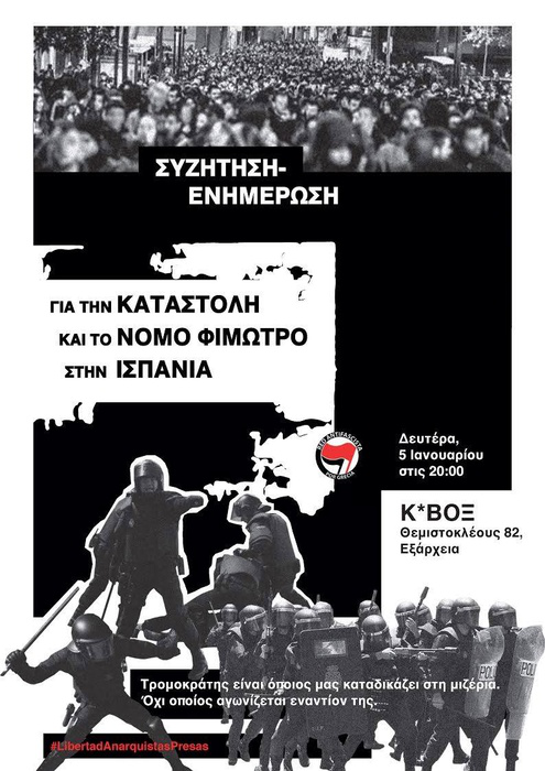 Στις 5 Ιανουαρίου στις 20.00 στο Κ*ΒΟΞ (Θεμιστοκλέους 82, Εξάρχεια, Αθήνα), καλούμε σε συζήτηση-ενημέρωση για την καταστολή και την ποινικοποίηση της αντίστασης στη Βαρκελώνη (Ισπανία).