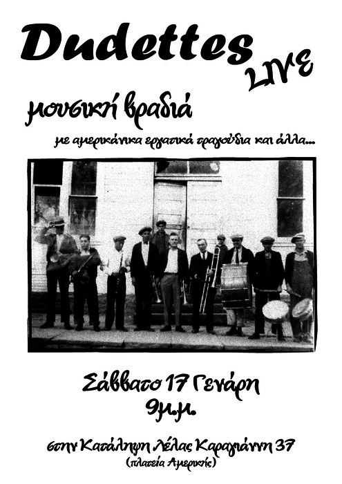 Η εκδήλωση Dudettes Live - Μουσική βραδιά με αμερικάνικα εργατικά τραγούδια και άλλα, που ήταν προγραμματισμένη για αύριο, Σάββατο 17 Γενάρη, στην Κατάληψη ΛΚ37, ΑΝΑΒΑΛΛΕΤΑΙ.