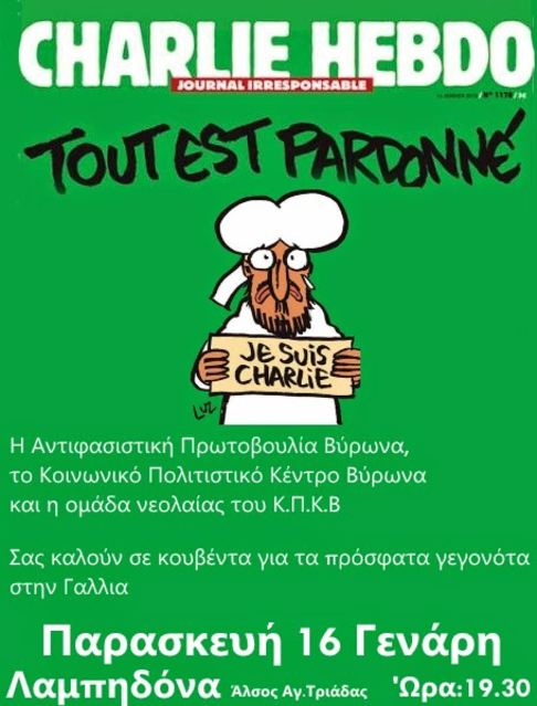 Με αφορμή την δολοφονία 10 δημοσιογράφων της εβδομαδιαίας σατιρικής/πολιτικής εφημερίδας charlie hebdo στο Παρίσι, η Αντιφασιστική Πρωτοβουλία Βύρωνα, το Κοινωνικό Πολιτιστικό Κέντρο Βύρωνα και η ομάδα νεολαίας του Κοινωνικού Πολιτιστικού Κέντρου, πήραμε την πρωτοβουλία να διοργανώσουμε ανοικτή συζήτηση την Παρασκευή 16 Ιανουαρίου στις 7:30 μμ στη Λαμπηδόνα.