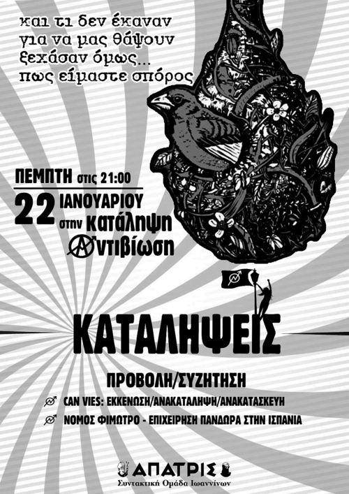 Η συντακτική ομάδα Ιωαννίνων της εφημερίδας δρόμου Άπατρις, διοργανώνει προβολή/συζήτηση στην ανακατειλημμένη Αντιβίωση, την Πέμπτη 22 Γενάρη, στις 21:00, με βασικές θεματικές: