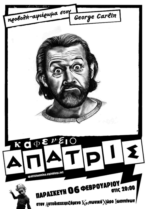 Στις 20:00, θα προβληθεί βίντεο-αφιέρωμα στον stand-up κωμικό George Carlin. Επίσης, στο χώρο θα υπάρχει τραπεζάκι με βιβλία κινηματικών εκδόσεων, απ' την ομάδα διακίνησης εντύπων του Α.Κοι.Χ.Ι. Στον Αυτοδιαχειριζόμενο Κοινωνικό Χώρο Ιωαννίνων θα υπάρχει κουτί οικονομικής ενίσχυσης, με τον καθένα και την καθεμιά να συνδράμει ελεύθερα σύμφωνα με τις δυνατότητες του/της.