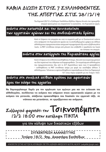 Συγκέντρωση αλληλεγγύης στους συλληφθέντες της απεργίας της Κυριακής 28/12/14