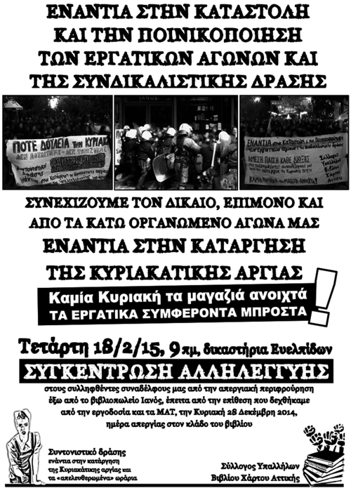 Η Κυριακή 28 Δεκέμβρη ήταν η όγδοη Κυριακή μέσα στο χρόνο και η τρίτη Κυριακή μέσα στο μήνα που κράτος και αφεντικά προσπάθησαν να επιβάλλουν το άνοιγμα των καταστημάτων. Ο Σύλλογος Υπαλλήλων Βιβλίου Χάρτου Αττικής στο πλαίσιο της υπεράσπισης της Κυριακάτικης αργίας, κήρυξε απεργία στον κλάδο του βιβλίου. Το Συντονιστικό Δράσης ενάντια στην κατάργηση της Κυριακάτικης αργίας και τα "απελευθερωμένα" ωράρια στήριξε την απεργιακή κινητοποίηση, ενισχύοντας μαζί με εργαζόμενους και αλληλέγγυους τις απεργιακές περιφρουρήσεις στα καταστήματα Ιανός και Παπασωτηρίου.