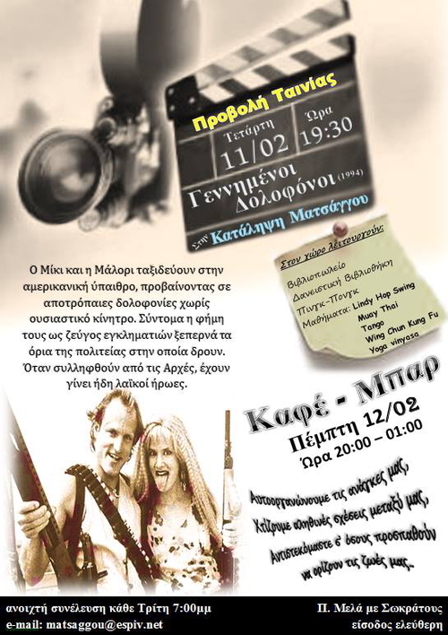 - Τετάρτη 11/2 στις 19:30 προβολή ταινίας (Γεννημένοι Δολοφόνοι)