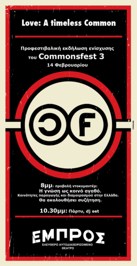 Επειδή πιστεύουμε πως ο έρωτας είναι αυτό που μοιραζόμαστε έξω από τον επίπλαστο κόσμο της κατανάλωσης, την ημέρα του Αγίου Βαλεντίνου, ημέρα της εμπορευματοποίησης του έρωτα, σας καλούμε σε ένα ξέφρενο και ρομαντικό πάρτυ με dj set και τίτλο "Love: A Timeless Common" στο Ελεύθερο Αυτοδιαχειριζόμενο Θέατρο ΕΜΠΡΟΣ (Ρήγα Παλαμήδου 2, Ψυρρή). Θα προηγηθεί στις 20:00 η πρώτη δημόσια προβολή του ντοκυμαντέρ "Η Γνώση ως Κοινό Αγαθό - Κοινότητες Παραγωγής και Διαμοιρασμού στην Ελλάδα" και θα ακολουθήσει συζήτηση με τον δημιουργό Ηλία Μαρμαρά και τις ομάδες που συμμετείχαν σε αυτό.