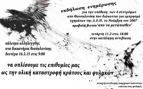 Εκδήλωση ενημέρωσης για τους 4 συντρόφους που κατηγορούνται για τον εμπρησμό οχημάτων της Δ.Ε.Η, το Δεκέμβρη του 2007 και προβολή βίντεο "από τα μετώπισθεν".