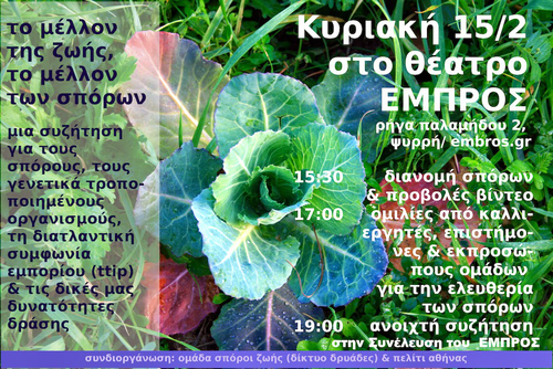 Των ομιλιών θα προηγηθεί διανομή σπόρων και προβολή βίντεο (15:30 - 17:00), ενώ με την ολοκλήρωσή τους θα ακολουθήσει ανοιχτή συζήτηση σχετικά και γενική συνέλευση του Εμπρός. Η εκδήλωση συνδιοργανώνεται από τους Σπόρους Ζωής/ Δίκτυο Δρυάδες και το Πελίτι Αθήνας.