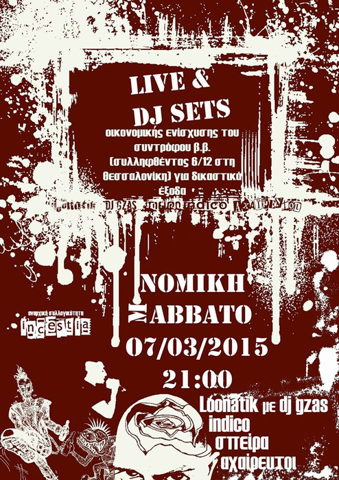 Live & Aftermath Party με Dj Sets οικονομικής ενίσχυσης του συντρόφου Β.Β. ,διωκόμενο για την πορεία της 06/12 στη Θεσσαλονίκη.