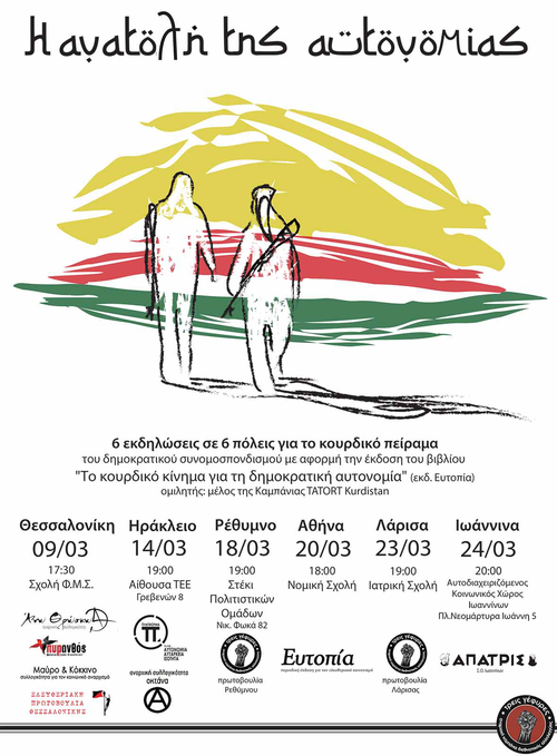 Το τριήμερο 13-14-15 Μαρτίου 2015 διοργανώνουμε μία σειρά εκδηλώσεων με τίτλο "Η ανατολή της Αυτονομίας", και κύριο στόχο την έμπρακτη αλληλεγγύη στον αγώνα του κουρδικού λαού για την ελευθερία του.