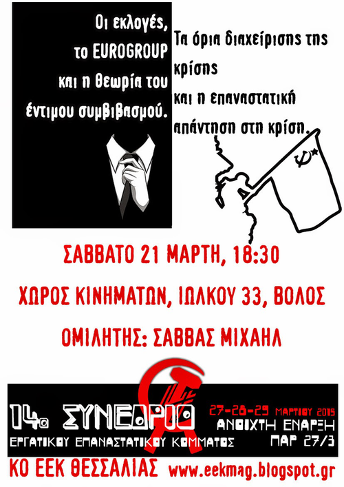 Το Εργατικό Επαναστατικό Κόμμα σας καλεί στην εκδήλωση που οργανώνεται στο Βόλο το Σάββατο, 21 Μάρτη, 18:30, στο ΧΩΡΟ ΚΙΝΗΜΑΤΩΝ, Ιωλκού 33-Βόλος για μια ανοικτή συζήτηση από τις εκλογές της 25 Γενάρη μέχρι τη θεωρία του έντιμου συμβιβασμού με ενδιάμεσο σταθμό τo Eurogroup 20 Φλεβάρη και κατάληξη στην έκρηξη της Φρανκφούρτης στις 18 Μάρτη.