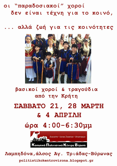 Τα επόμενα τρία Σάββατα 21, 28/3 και 4/4 στις 4μμ θα συναντηθούμε για να χορέψουμε κρητικά.