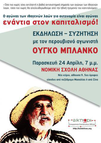 Για την πολυμορφία των ιθαγενικών κινημάτων, για την αντισυστημικότητά τους και τους σημερινούς τους αγώνες ενάντια στο καπιταλιστικό μοντέλο ανάπτυξης και ενάντια στην ιδέα του κράτους ως μορφή οργάνωσης της κοινωνίας θα μιλήσουμε τηνΠαρασκευή, 24 Απρίλη, στις 7μ.μ., στο Νέο κτίριο Νομικής, αίθουσα 9, 5ος όροφος