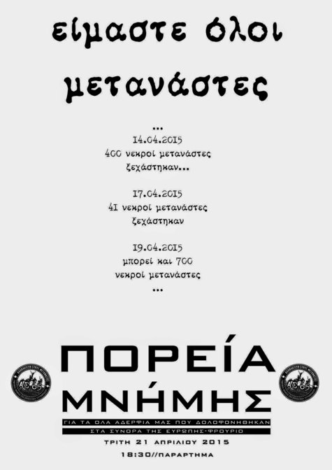 Την ίδια στιγμή που το ελληνικό κράτος και διάφοροι μηχανισμοί του ξεπλένονται σε "αντιναζιστικές" δίκες, κάποιοι έχουν την τσίπα να κατανοούν ότι ο σύγχρονος ολοκληρωτισμός (θεσμικά και κοινωνικά) εξακολουθεί να δουλεύει -με τις μηχανές στο κόκκινο. Στην ευρώπη, όπως και στην έλλαδα. Στα σύνορα και πέρα απ' αυτά.