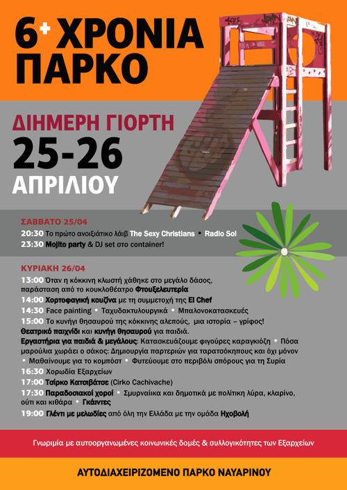 Το Σαββατοκύριακο που μας έρχεται γιορτάζουμε τα έκτα γενέθλια του Αυτοδιαχειριζόμενου πάρκου Ναυαρίνου. Είναι μια καλή ευκαιρία να ξαναβρεθούμε λοιπόν, όσοι μέσα από διαφορετικές διαδρομές, διασταυρωθήκαμε κάποια στιγμή στο πάρκο και με κάποιο τρόπο συνδεθήκαμε, προσωρινά ή μονιμότερα, μ´αυτό το ξεχωριστό κομμάτι γης αλλά και μεταξύ μας. Ελάτε να γιορτάσουμε μαζί!