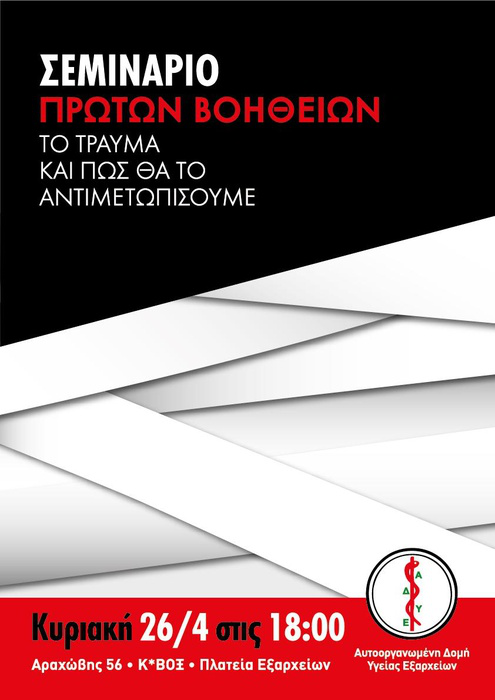 Η Αυτοοργανωμένη Δομή Υγείας Εξαρχείων στα πλαίσια των ανοικτών κύκλων σεμιναρίων της Πρώτων Βοηθειών,αυτή την εβδομάδα παρουσιάζει "Το τραύμα και πώς θα το αντιμετωπίσουμε". ΚΥΡΙΑΚΗ 26 ΑΠΡΙΛΙΟΥ ΣΤΙΣ 18:00 Αραχώβης 56, Κ*ΒΟΞ, πλατεία Εξαρχείων.