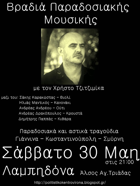 Το Κοινωνικό Πολιτιστικό Κέντρο Βύρωνα σας καλεί το Σάββατο 30 Μάη στις 21:00 στην παροδοσιακή βραδιά που διοργανώνει με τον Χρήστο Τζιτζιμίκα και την ορχήστρα του. Οι μουσικές που θα ακούσουμε θα είναι ένα μουσικό ταξίδι στους δρόμους της Πόλης των Ιωαννίνων και της Σμύρνης.