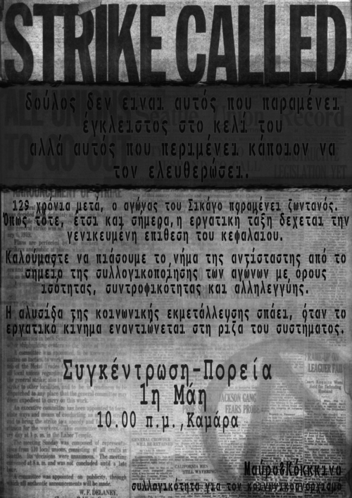 129 χρόνια μετά, ο αγώνας του Σικάγο παραμένει ζωντανός. Όπως τότε, έτσι και τώρα πραγματοποιείται μια γενικευμένη επίθεση στην εργατική τάξη υπό το πρόσχημα, όμως τώρα, της οικονομικής κρίσης. Η μεθόδευση αυτής της ληστρικής στρατηγικής από την άρχουσα τάξη επιτυγχάνεται μέσω της άρσης του 8ωρου εργασίας, την κατάργηση των συλλογικών συμβάσεων, την εδραίωση της επισφαλούς εργασίας και την συνεχή μείωση του βασικού μισθού. Βασική συνθήκη λειτουργίας του καπιταλισμού είναι ,ανέκαθεν, το καθεστώς εξαίρεσης και η παρανομοποίηση της ύπαρξης και της εργασίας. Η άρχουσα τάξη, κοιτώντας πάντοτε την εξυπηρέτηση των συμφερόντων της, εξασφαλίζει το φθηνότερο εργατικό δυναμικό μέσω της διατήρησης και κατά καιρούς της διόγκωσης μίας στρατιάς ανέργων.
