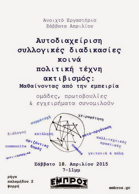 Το εργαστήριο αυτό επιδιώκει μια γόνιμη ανταλλαγή απόψεων και εμπειριών μεταξύ όσων συμμετείχαν ή συμμετέχουν στο εγχείρημα του Εμπρός, αλλά και άλλων που μπορούν να μεταφέρουν τις δικές τους εμπειρίες τους από πρωτοβουλίες, εγχειρήματα αυτοοργάνωσης αυτοδιαχείρισης, τέχνης και πολιτικής.