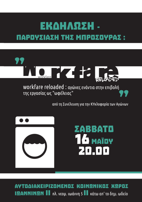 Σάββατο 16 Μάη στις 20:00 Εκδήλωση - παρουσίαση της μπροσούρας Workfare reloaded «Αγώνες ενάντια στην επιβολή της εργασίας ως <<ωφέλειας>>» απο τη Συνέλευση για την ΚΥκλοφορία των Αγώνων
