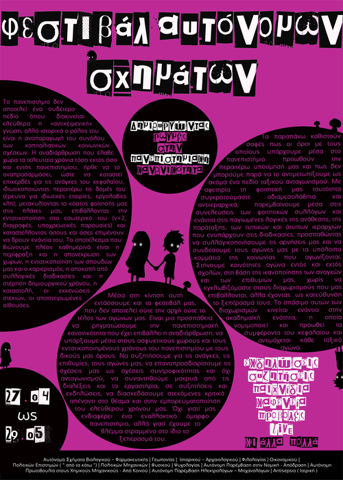 Μέσα στη κίνηση αυτή εντάσσουμε και το φεστιβάλ μας, που δεν αποτελεί ούτε την αρχή ούτε το τέλος των αγώνων μας. Είναι μια προσπάθεια να ρηγματώσουμε την πανεπιστημιακή κανονικότητα που έχει επιβάλλει η αναδιάρθρωση, να υπάρξουμε μέσα στους ασφυκτικούς χώρους και τους εντατικοποιημένους χρόνους του πανεπιστημίου με τους δικούς μας όρους. Να συζητήσουμε για τις ανάγκες, τις επιθυμίες, τους αγώνες μας, να επαναπροσδιορίσουμε τις σχέσεις μας ως σχέσεις συντροφικότητας και όχι ανταγωνισμού, να συναντηθούμε μακρυά από τις διαλέξεις και τα εργαστήρια, σε συζητήσεις και εκδηλώσεις, να διασκεδάσουμε στεκόμενες κριτικά απέναντι στο θέαμα και στην εμπορευματοποίηση του ελεύθερου χρόνου μας. Όχι γιατί μας ενδιαφέρει ένα εναλλακτικό όμορφο πανεπιστήμιο, αλλά γιατί έχουμε το βλέμμα στραμμένο στο ίδιο το ξεπέρασμά του.